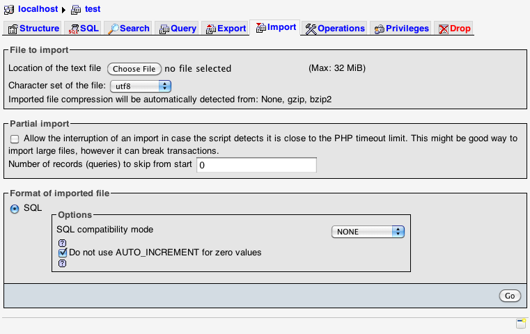 5. Now switch over to your live/production database, go to the “Import” tab, and upload the 3 files to it.