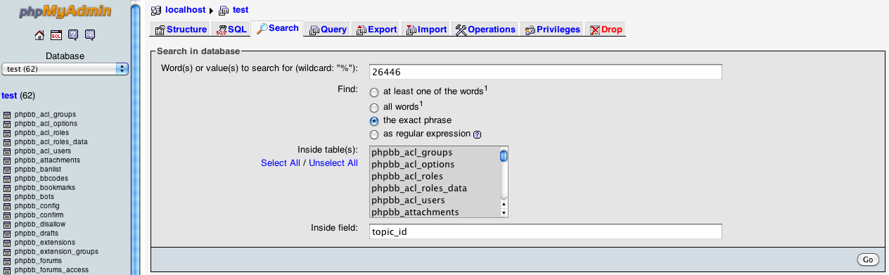 2. Go to search, enter your ID number as the search value, exact match, select all tables, and specify “topic_id” for the inside field.