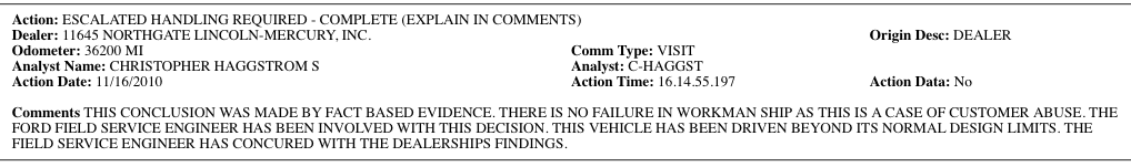 For those of you thinking this is a “one in a million” occurance, take a look at the Google results for “Ford Warranty Denied”.